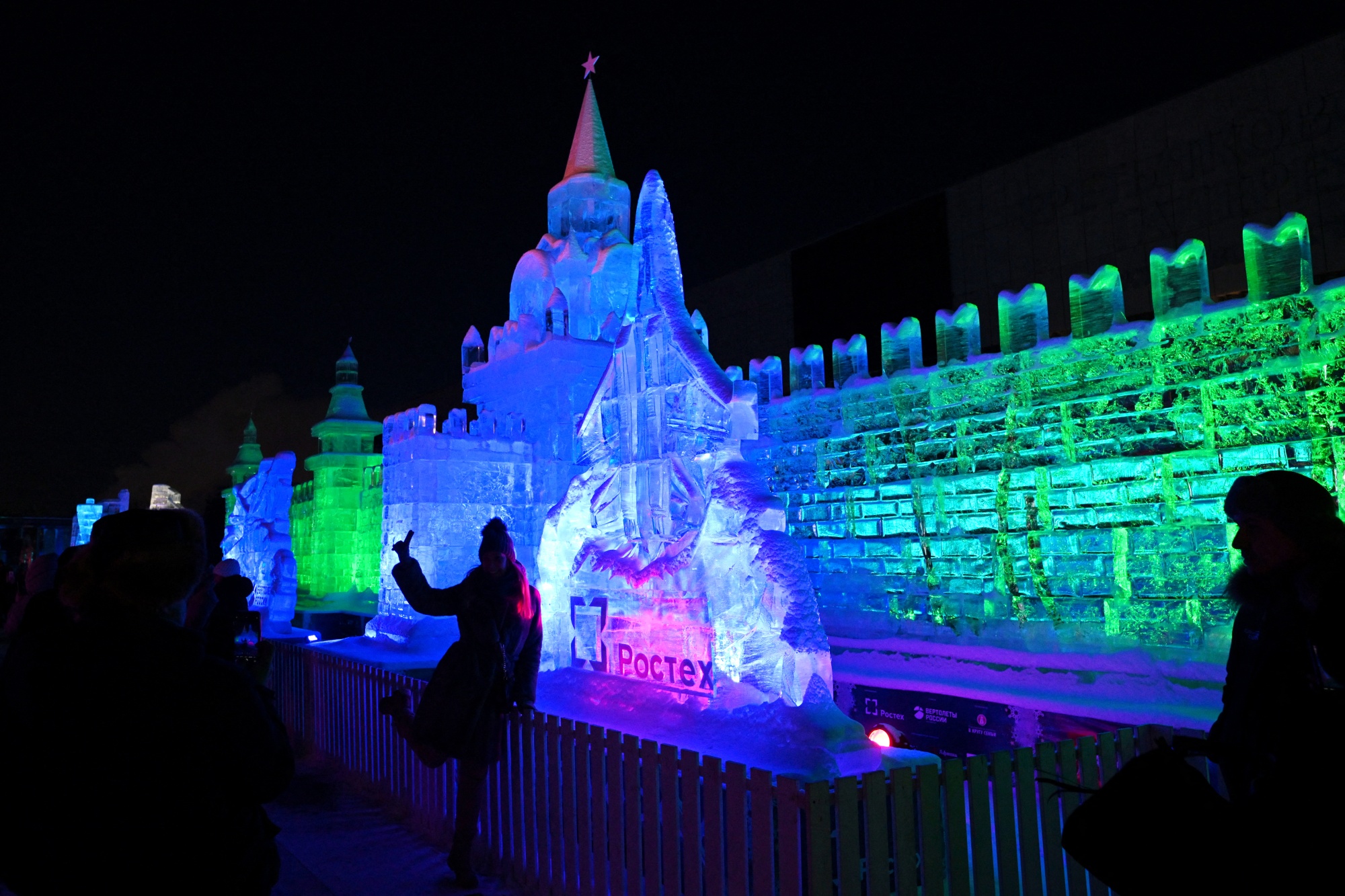 莫斯科上个月举办的冰雕节上展示的克里姆林宫冰雕复制品。