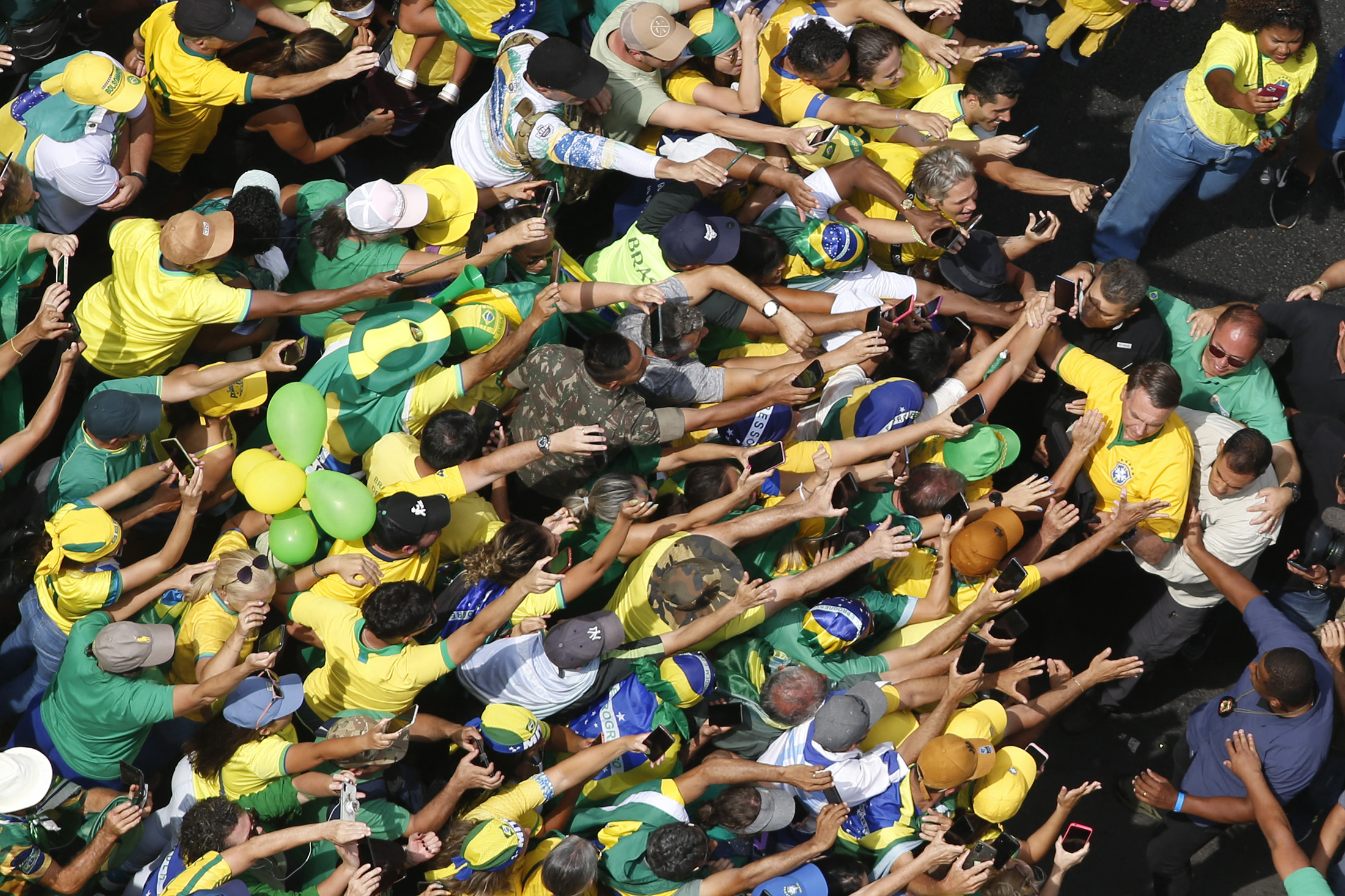 Jair Bolsonaro抵达圣保罗的一场集会。摄影师:Miguel Schincariol/AFP/Getty Images