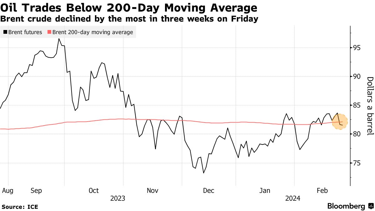 布伦特原油在周五下跌了2.5%后稳定在每桶82美元以下,而美国对手西德克萨斯中质原油价格在每桶76美元以上。期货在本周最后一个交易日跌破了它们的200日移动平均线,引发了一些算法性的抛售。