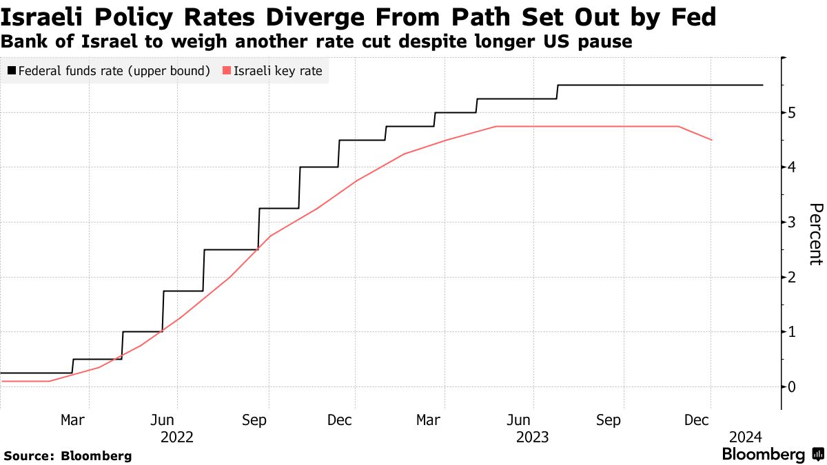 在经历了长时间基本跟随美联储的领导将借贷成本提高至2006年以来最高水平后,以色列央行已经在年初降息,与美国同行产生了分歧。但在哈马斯在十月发动袭击之后,优先事项发生了变化,这一冲击导致上个季度经济几乎创下了近记录的收缩,同时通胀保持温和。