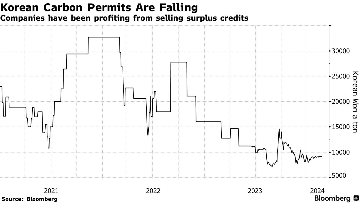 韩国的许可证在过去一年中下降了约43%,每吨为9130韩元,是世界最大的总量限制和交易系统欧盟的一小部分。碳交易在这个27个国家的集团中并不是一个立即成功,在2008年金融危机使工业陷入困境并导致过剩后,许可证暴跌超过90%。