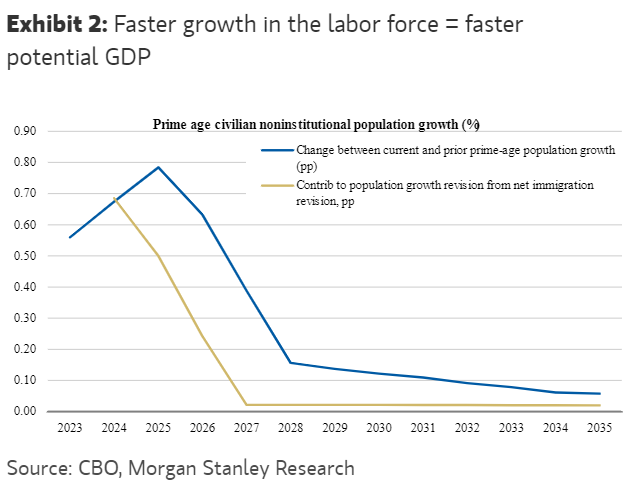 国会预算办公室本月早些时候公布的新美国人口估计,将包括移民增加,可能有助于解释2023年经济出乎意料的韧性,摩根士丹利的经济学家们假设。