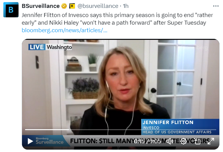 Invesco的詹妮弗·弗利顿正在关注黑利退出的时机之外的事情,随着一些亿万富翁支持者们关闭资金来源。弗利顿的关注点是:“当她离开竞选时,她会像她承诺的那样支持特朗普吗?然后她会支持并像[朗] 德桑蒂斯那样悄悄离开吗,还是她会支持并成为这次选举的代理人?”