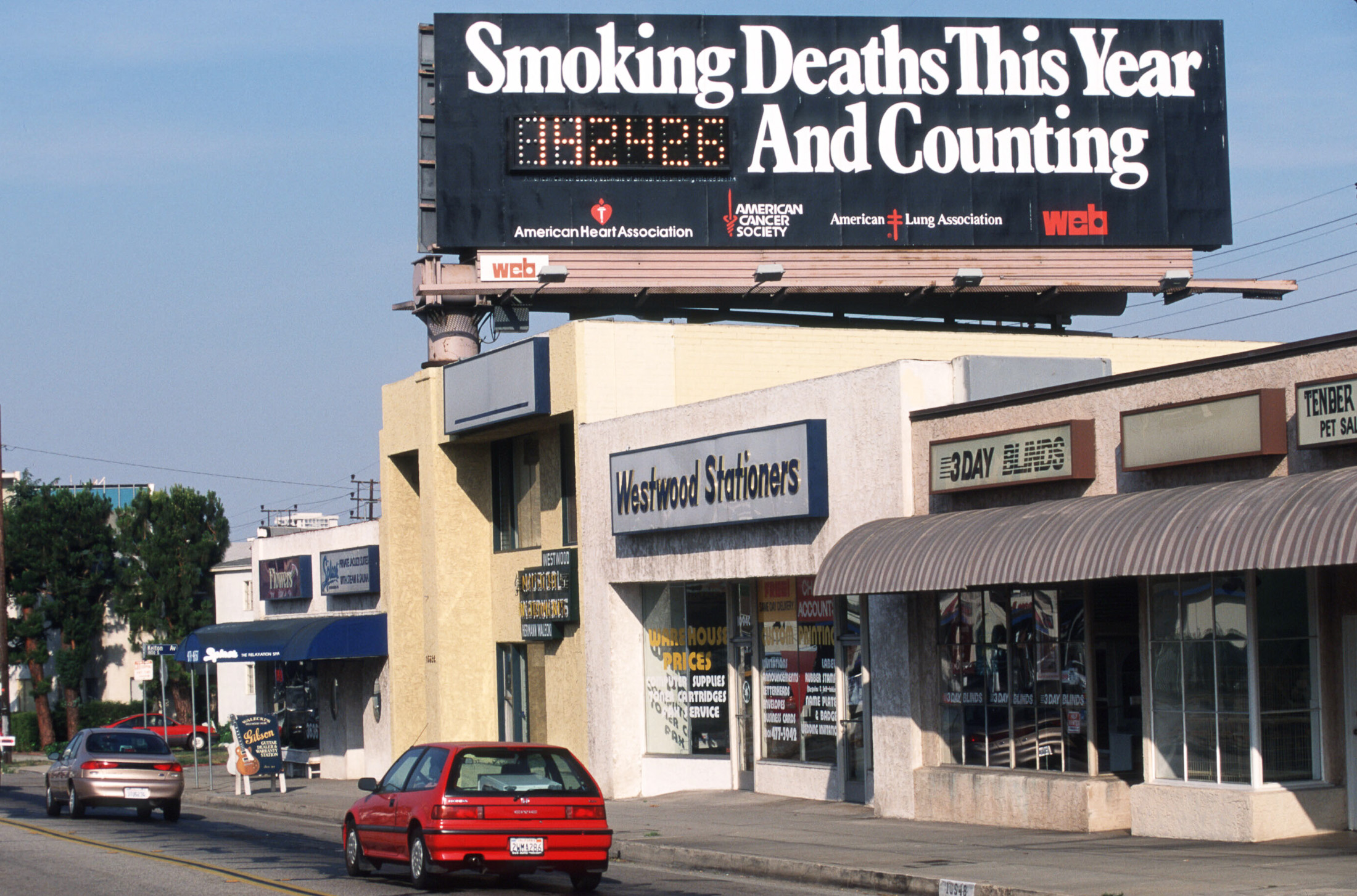1997年,洛杉矶的一块反吸烟广告牌警告人们香烟的危险。摄影师:吉尔·明加松/档案照片/盖蒂图片社### 容易被忽视