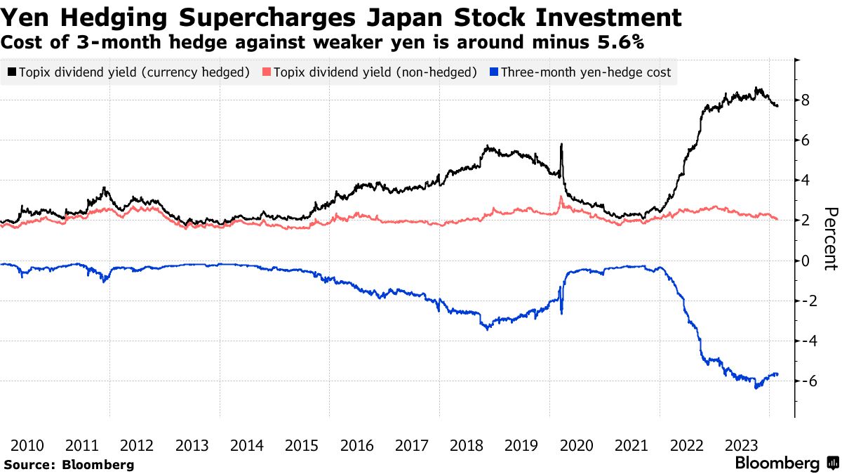 对于预计日元将进一步走弱的以美元为基础的投资者来说,对冲仍然是一个有吸引力的选择,考虑到日元与日本股市之间的强烈反向相关性。对冲抵御日元贬值的三个月成本为负5.6%,表明押注货币疲软的投资者只要日元不大幅升值就能获利。根据彭博社编制的估算,预计日元将在2024年底升值至137美元。
