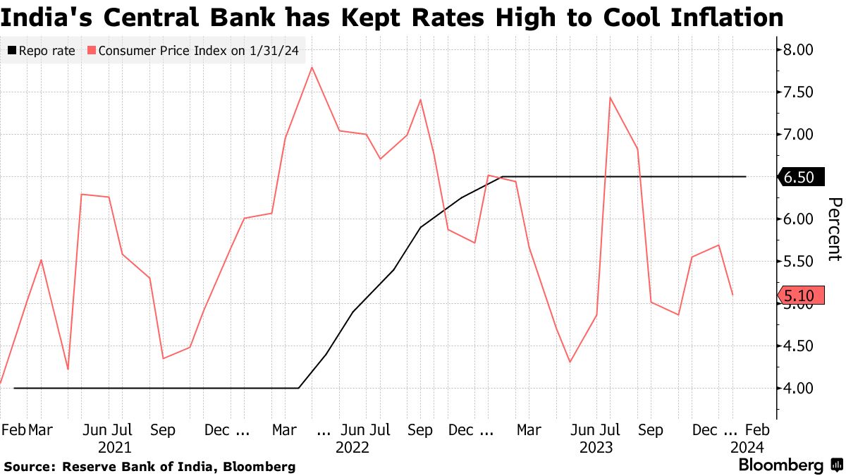 央行已经连续六次会议保持其基准回购利率 不变,因为它试图将通胀率稳定在4%的目标水平上。通胀率在一月份降至5.1%,为三个月来的最低水平,印度央行预计在从四月开始的下一个财政年度中,通胀率将平均为4.5%。