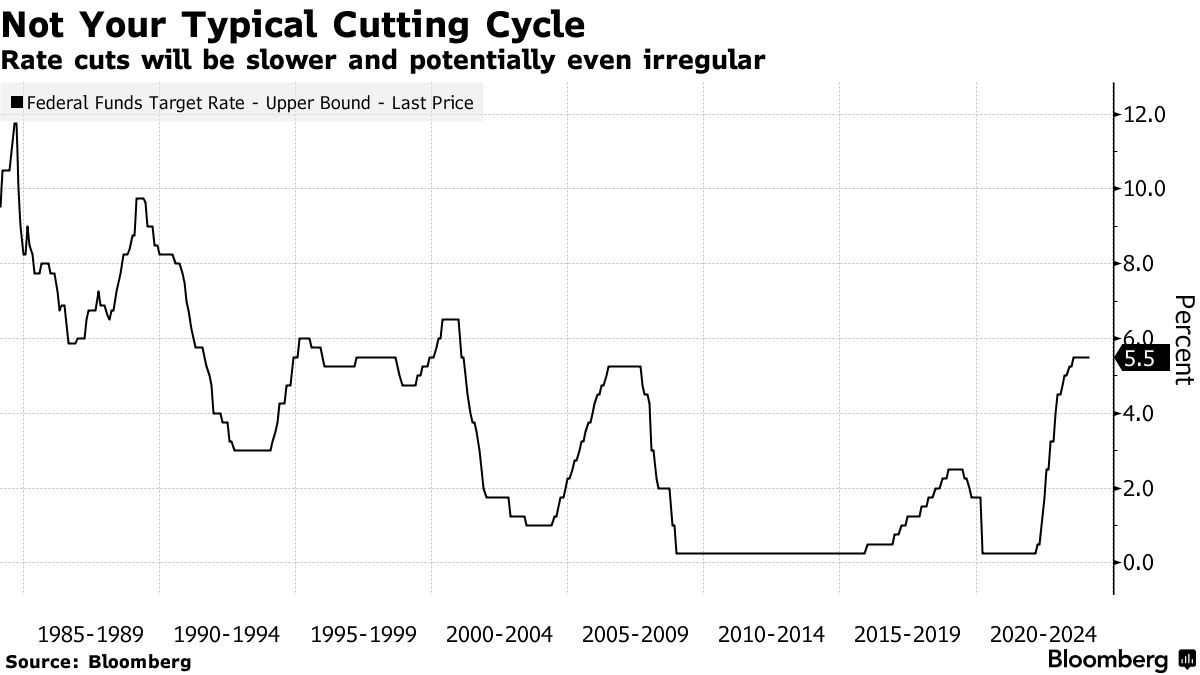 随着价格压力减轻,经济仍然强劲,美联储官员准备以更慢、可能更不规律的速度降低利率。2022年和2023年,利率上升速度是四十年来最快的,因为中央银行试图遏制飙升的通货膨胀。现在,几位官员在最近几天提出了关于实践中可能会是什么样子的暗示,大多数人都围绕着一种谨慎和缓慢的方式达成一致。副主席菲利普·杰斐逊提到了上世纪90年代中期,当时美联储通过降息实现了经济的软着陆,暂停了三次会议,然后进一步降低了利率。