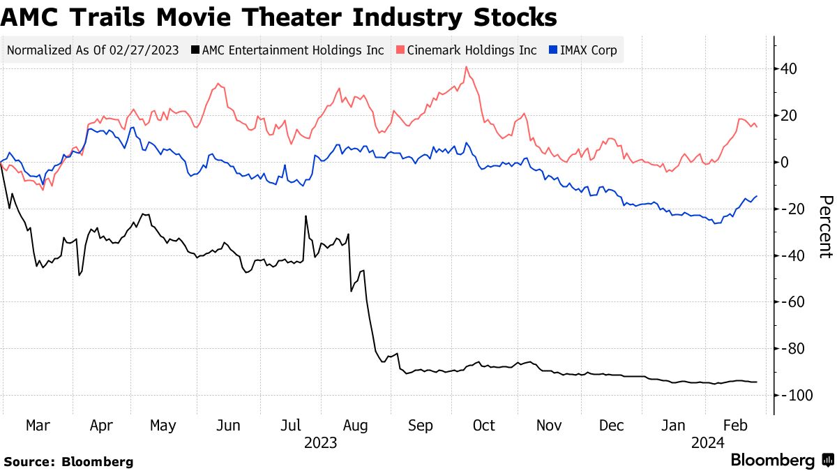 该股票在2024年初下跌了27%,触及有史以来的最低点。该公司及其同行 — 包括Cinemark Holdings Inc.和Imax Corp. — 正在应对美国票房收入下降的困境,去年好莱坞演员和编剧的罢工延迟了电影的推出,使行业在巴本海默的帮助下从疫情中复苏的努力受挫。