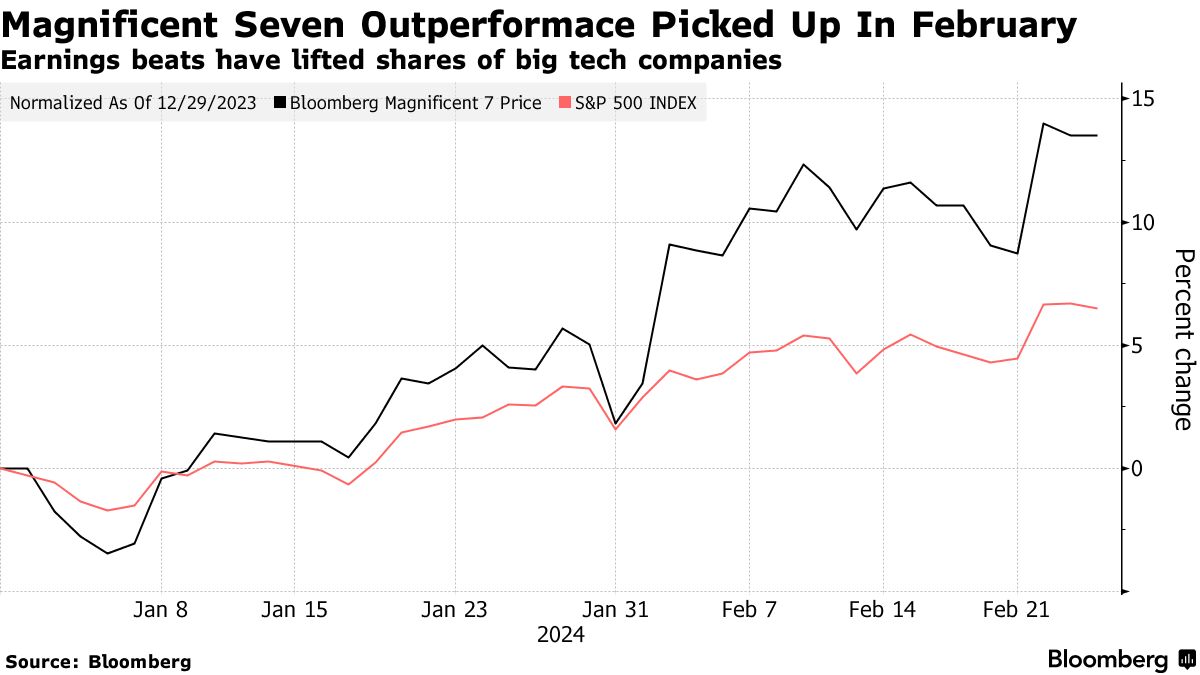 由英伟达公司、Meta平台公司、微软公司和亚马逊公司组成的“辉煌七大科技公司”集团,其平均每股收益在去年第四季度较去年同期增长了55%,根据彭博社编制的数据。这个集团中的大多数公司已经帮助推动纳斯达克100指数创下历史新高,并连续第四个月实现涨幅。