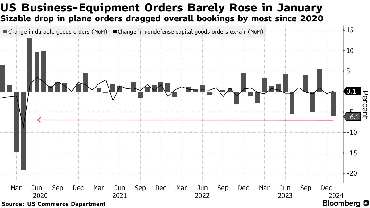 商务部的报告显示,商用飞机订单(每月波动较大)下降了近60%,是自2020年6月以来最多的。