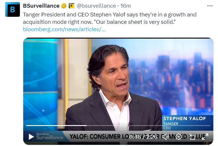 Tanger公司首席执行官Stephen Yalof今天分享了对开放式购物中心业务的乐观看法。他说,Tanger正在将其物业重新塑造为经常光顾的目的地,提供餐饮和娱乐选择,而不再专注于郊区奥特莱斯中心和“购物中心体验”。