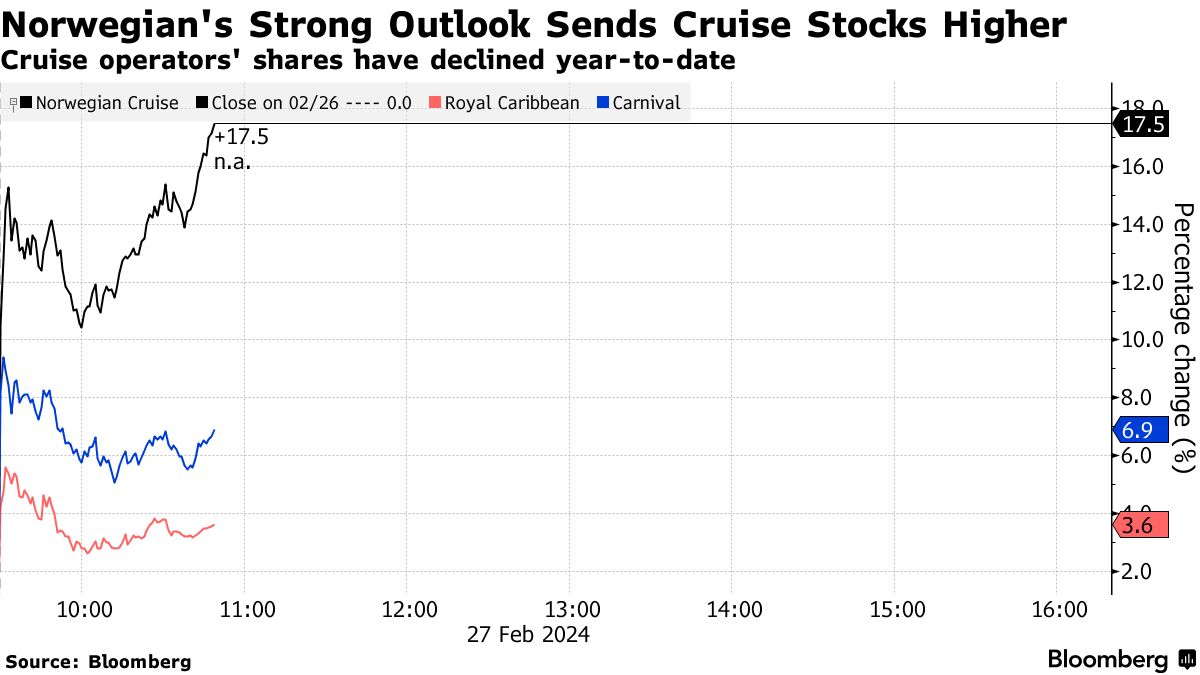 摄影师:Tim Rue/Bloomberg挪威邮轮控股公司股价在发布超出预期的指引后上涨,因其航行需求强劲。