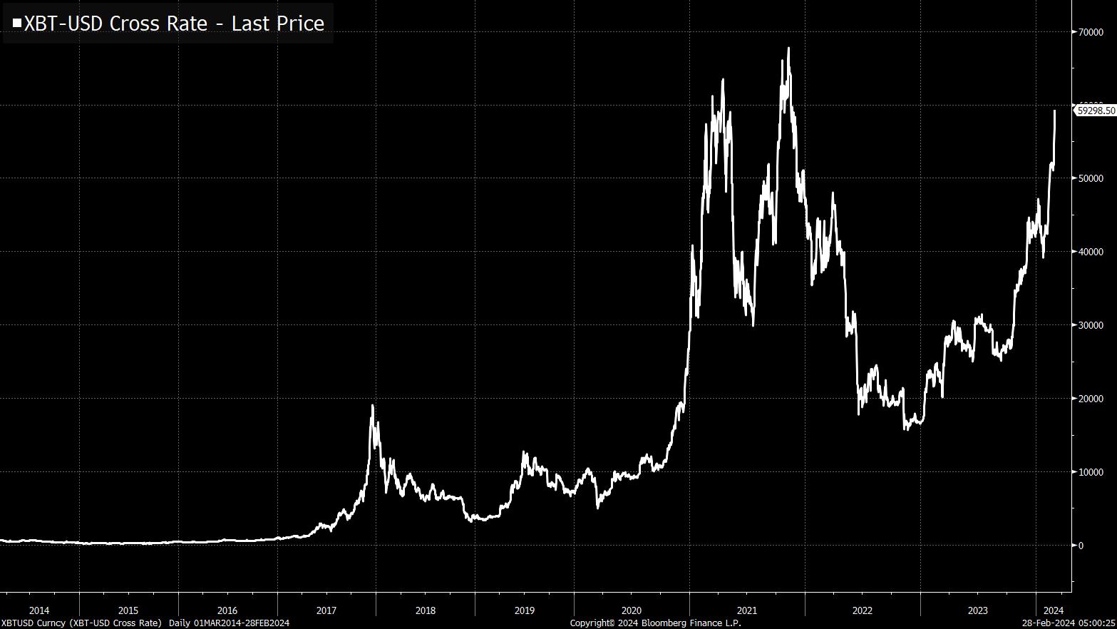 再次强调,这是一种非常不同的图表和不同类型的资产,与 Meta 不同。首先,比特币是一种更明显的投机资产。显然,它的交易方式也大不相同。它不会随着时间推移而上涨,而是会在短时间内爆发式增长,然后下跌,然后再次爆发式增长。然后重复这个过程。现在它正处于爆发式增长期。每一个这样的高峰看起来都像是一个泡沫达到顶峰的样子,是你不会预期很长时间内再次看到的水平。无论如何,我们现在处于一个未破裂的阶段。