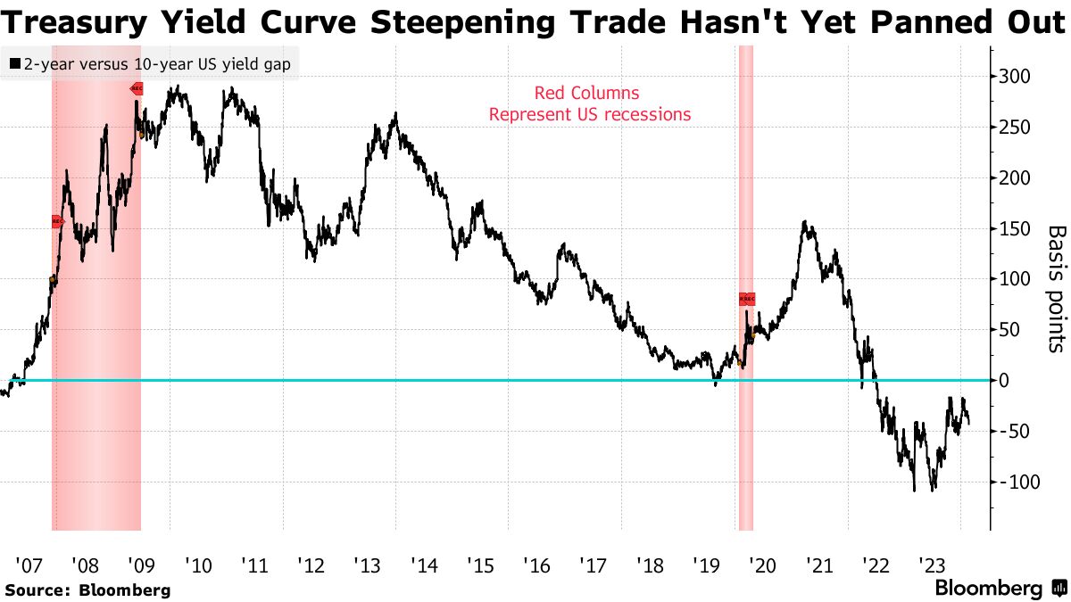 债券巨头太平洋投资管理公司的联合创始人比尔·格罗斯已经假定这种陡峭化将持续近两年。当高盛资产管理公司发布其2024年投资展望时,它宣称陡峭化,或者回归正常,是“最容易的交易之一。”