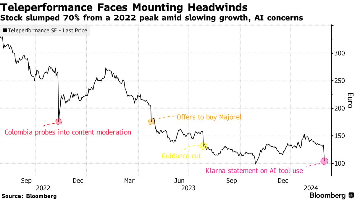 Teleperformance SE 股价周三暴跌,此前瑞典金融科技公司Klarna发布的一份 声明 重新引发了人们对人工智能可能损害这家法国公司呼叫中心业务的担忧。