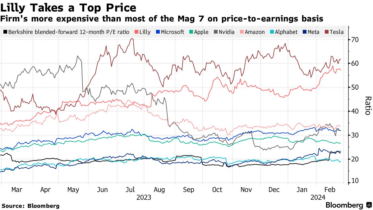 Lilly的估值溢价可能是华尔街怀疑的原因。该股目前的交易价格高于其五年平均水平,约为未来收益的57倍,远高于人工智能革命的领头羊英伟达,或者“辉煌七人组”中的任何其他公司,除了特斯拉公司。与此同时,伯克希尔的市盈率低于大多数公司。