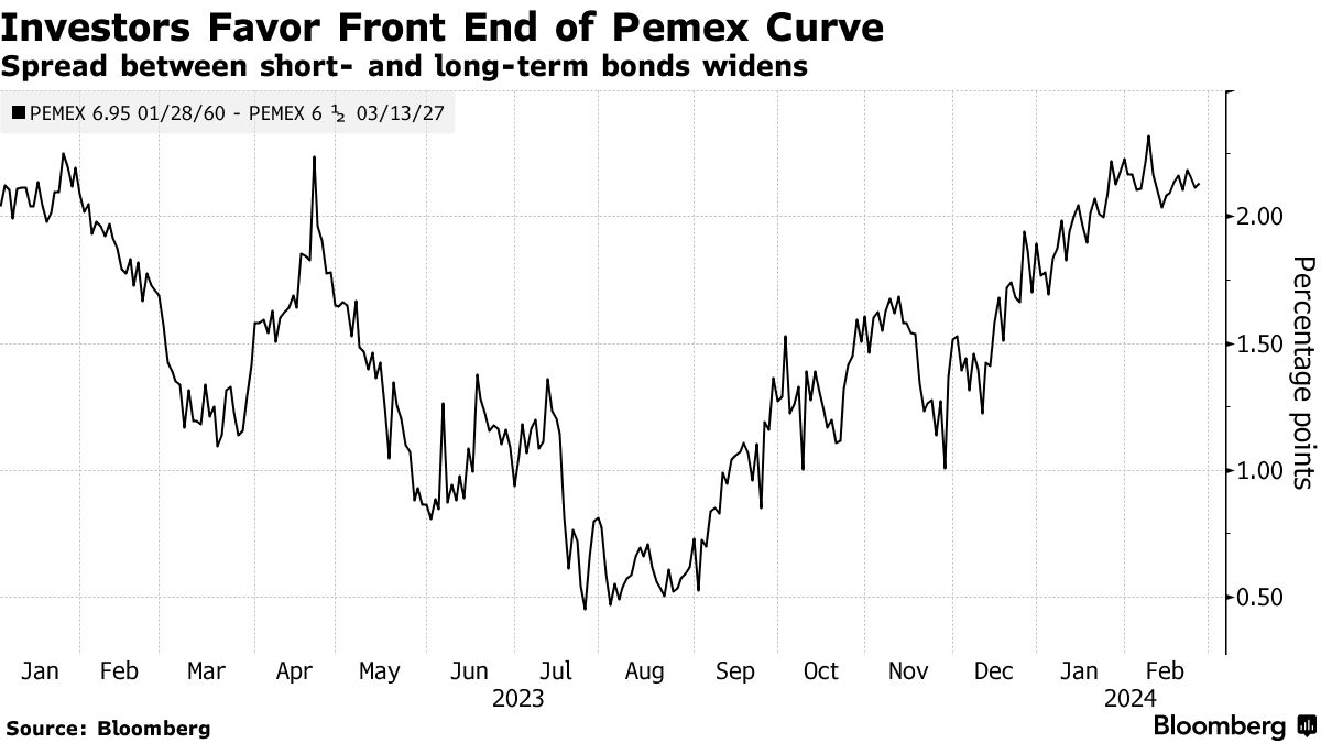 特别是墨西哥政府的援助帮助了2030年到期的墨西哥国家石油公司债券的风险溢价,使其从11月的6个百分点缩小到约4.6个百分点,数据显示。