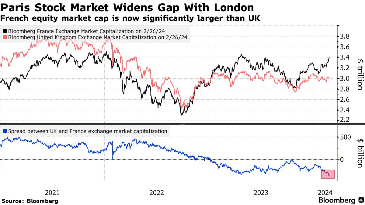 活动量从全球金融危机前的高峰急剧下降,FTSE全股指数的平均每日交易量从2007年同月的近150亿英镑下降到2024年2月的约34亿英镑(43亿美元)。投资者倾向于为流动性较差的股票支付较少的价格,因为当他们出售时面临更大的损失风险。根据前瞻市盈率,截至2月底,MSCI英国股指的交易价格比其美国对应指数低46%。