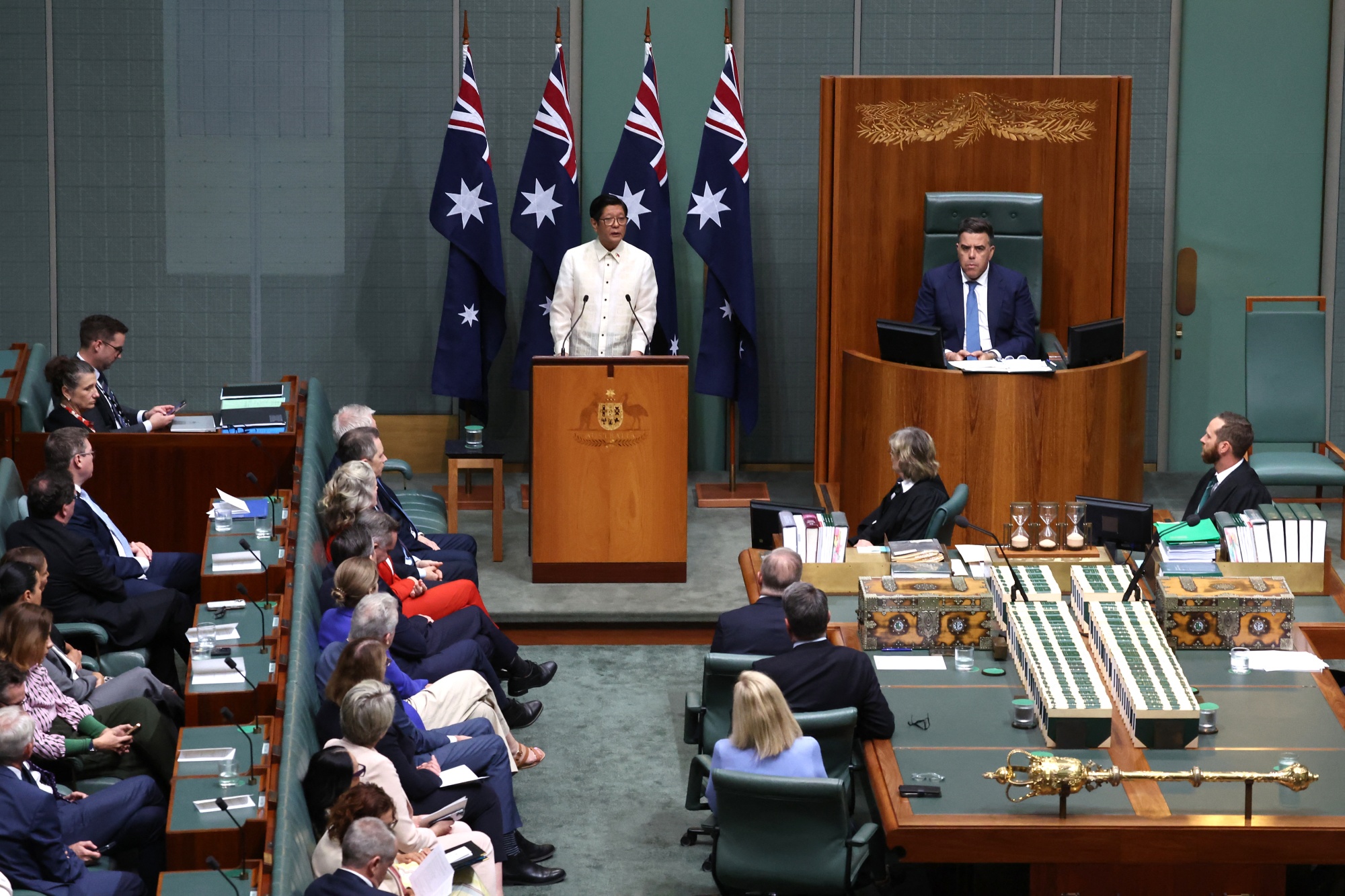 “我们不会屈服,”他对澳大利亚议员们表示,引发掌声。马科斯是首位在堪培拉国会联席会议上发表讲话的菲律宾领导人。