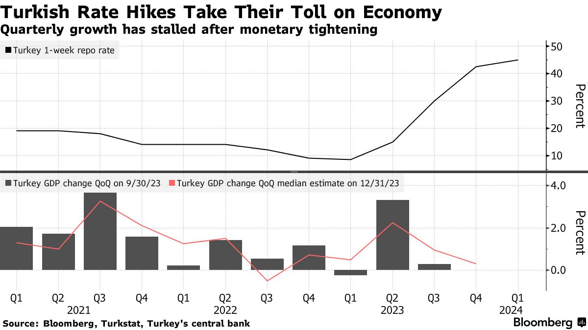 从年度基础上看,经济增长的动能减弱更为明显,根据彭博社另一项分析师调查的中位数估计,土耳其统计机构将在周四当地时间上午10点左右公布的数据显示,GDP增长率为3.5%,低于第三季度的5.9%。
