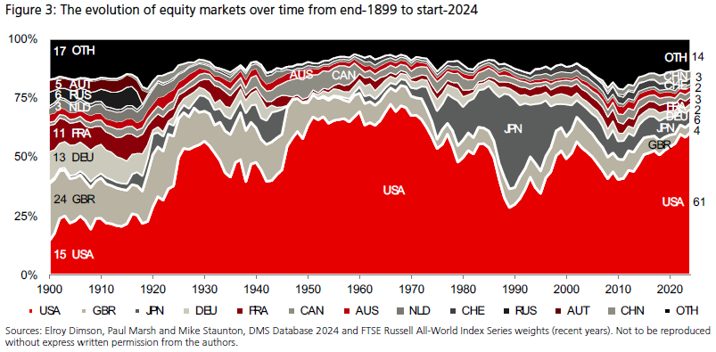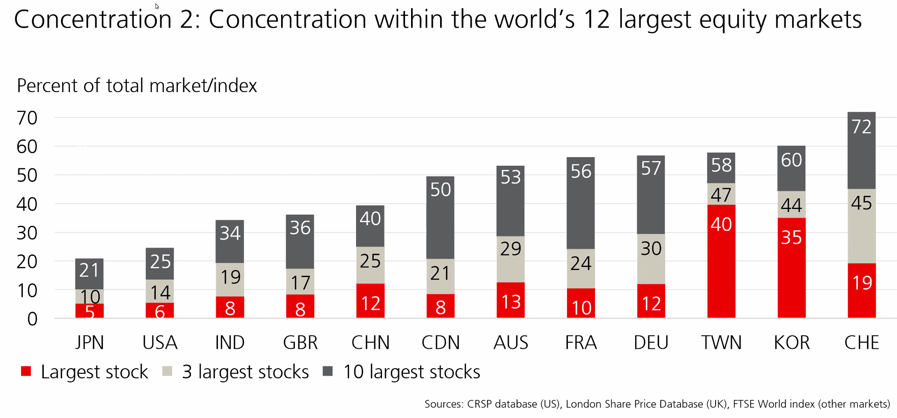 但这重要吗?这甚至算不上不寻常吗?这是一个理想的问题,适合在剑桥大学的埃尔罗伊·迪姆森教授和伦敦商学院的保罗·马什和迈克·斯坦顿教授进行了25年的权威研究《全球投资回报年鉴》中提出。迪姆森·马什·斯坦顿研究,如今由瑞士银行UBS赞助,涵盖了自20世纪初(对于美国和英国来说更早)以来股票、债券和现金的投资回报。这非常有用,倾向于出现在全球资产配置者的桌子和书架上。因此,以下是他们在本周出版的今年版中发现的关于集中度的内容。