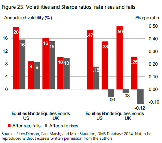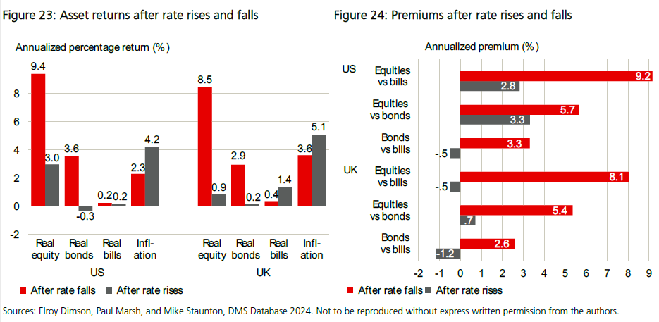 然而,在实践中,情况几乎看起来就是这样。对于股票和债券,降息时期的回报远远优于加息时期。在英国,令人惊讶的是,所有股票对现金的历史超额回报都发生在利率下降时;在利率上升期间,现金在历史上略微领先: