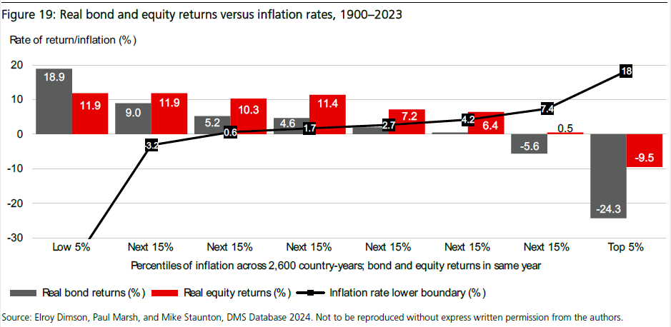 货币政策问题显然与通货膨胀密切相关。广义而言,投资者的工作是击败通货膨胀,因此这显然很重要。正如我们所预料的那样,通货膨胀最低的年份对股票和特别是债券非常有利,而通货膨胀最高的年份则与表现糟糕相关,尤其是对债券。这张图表基于年鉴中所有国家的每一年,跨越其历史,因此应该很好地分离通货膨胀对回报的影响: