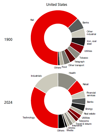 集中必然是坏事吗?不是,但它往往意味着一个不平衡的经济。一般来说,每个国家将由一两个行业主导,尤其是在新兴世界。直到最近,美国是一个例外。现在它主导的是科技,但与125年前新兴时期主导的铁路相比,科技主导程度并不那么高: