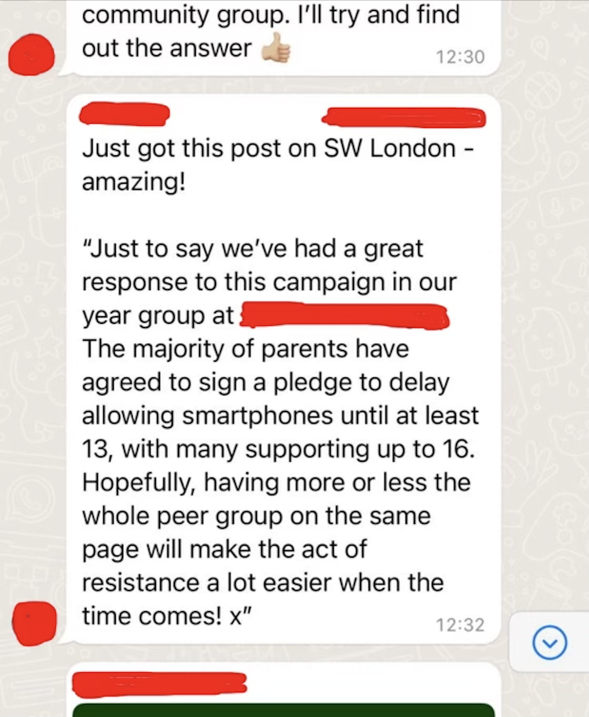 一条消息出现在新的WhatsApp群中,英国家长们同意不给孩子们买智能手机。姓名已被删除。来源:Clare Fernyhough她的目标是让全国每所小学中的30%家长做出相同的承诺,为他们自己和孩子之间创造更多选择。Fernyhough说:“如果有三分之一的人推迟购买手机,那么你就不会完全孤单。”