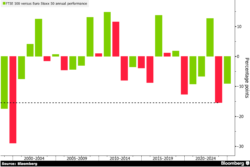 穆罗表示,他在伦敦的雇主在英国资产中持有不到5%的仓位,称客户希望全球投资组合能够将资金配置到他们认为可以获得最佳回报的地方。而这个地方并不是英国,去年英国市场的表现比欧洲斯托50指数差距最大的一年(后者仅在1998年推出)自1999年以来。富时100指数今年已经落后近10个百分点。