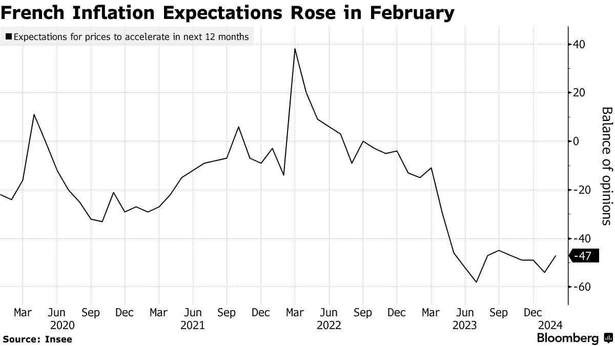 法国消费者并不相信价格压力会继续减轻:本周一项调查显示,家庭对未来的预期在二月份大幅上升。