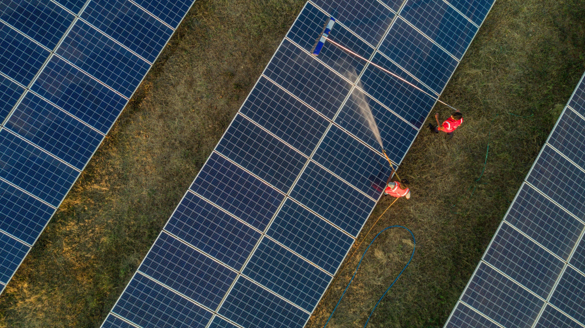 工人们在印度帕瓦加达的一个太阳能发电场清洗光伏板。