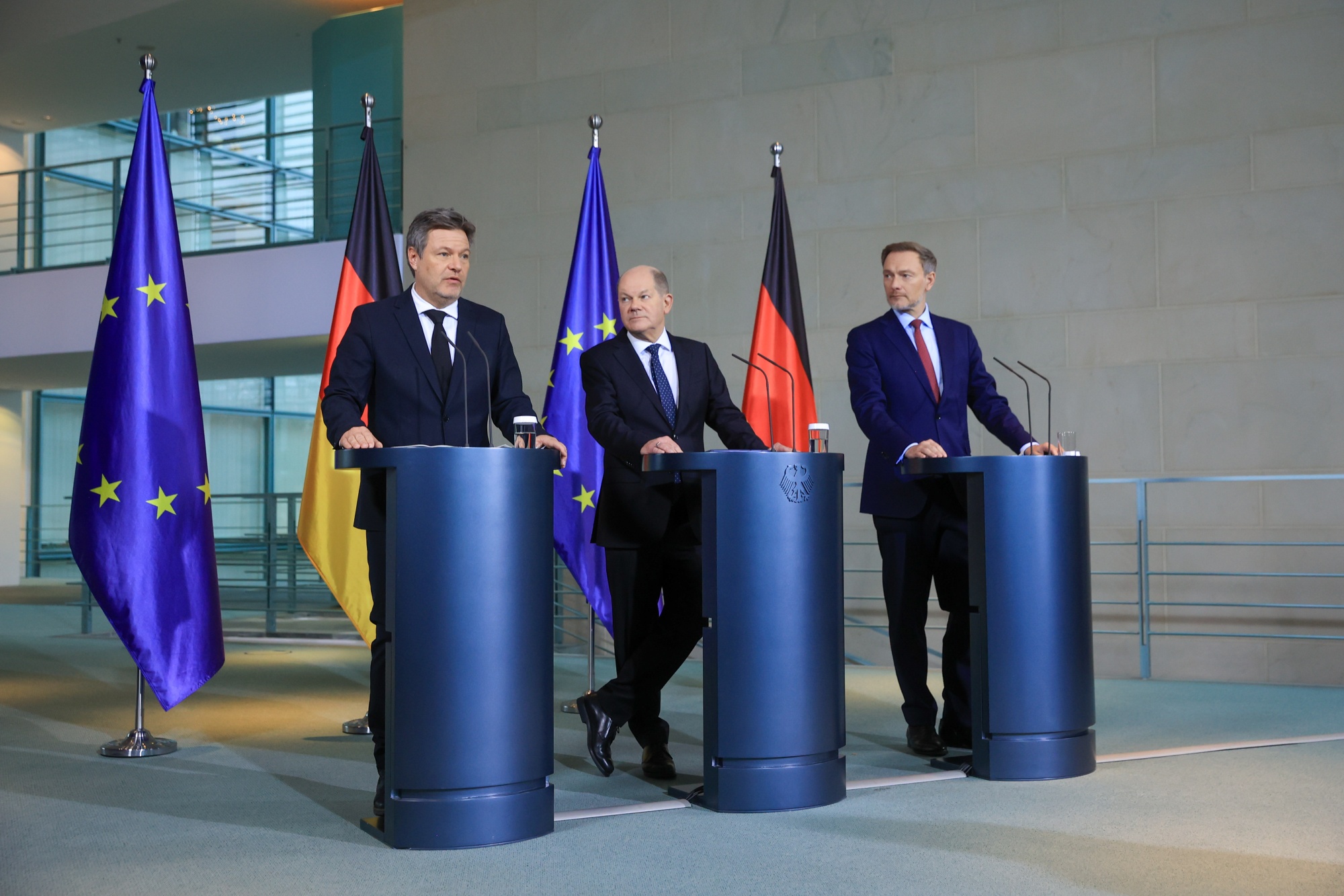 绿党的罗伯特·哈贝克(Robert Habeck),左,社会民主党的肖尔茨(Scholz),中,自由民主党的克里斯蒂安·林德纳(Christian Lindner),于2023年12月13日在柏林。摄影师:Krisztian Bocsi/Bloomberg总理奥拉夫·肖尔茨(Olaf Scholz)周四将深入东德进行罕见访问,以遏制极右翼AfD在9月份三个关键选举前的崛起。