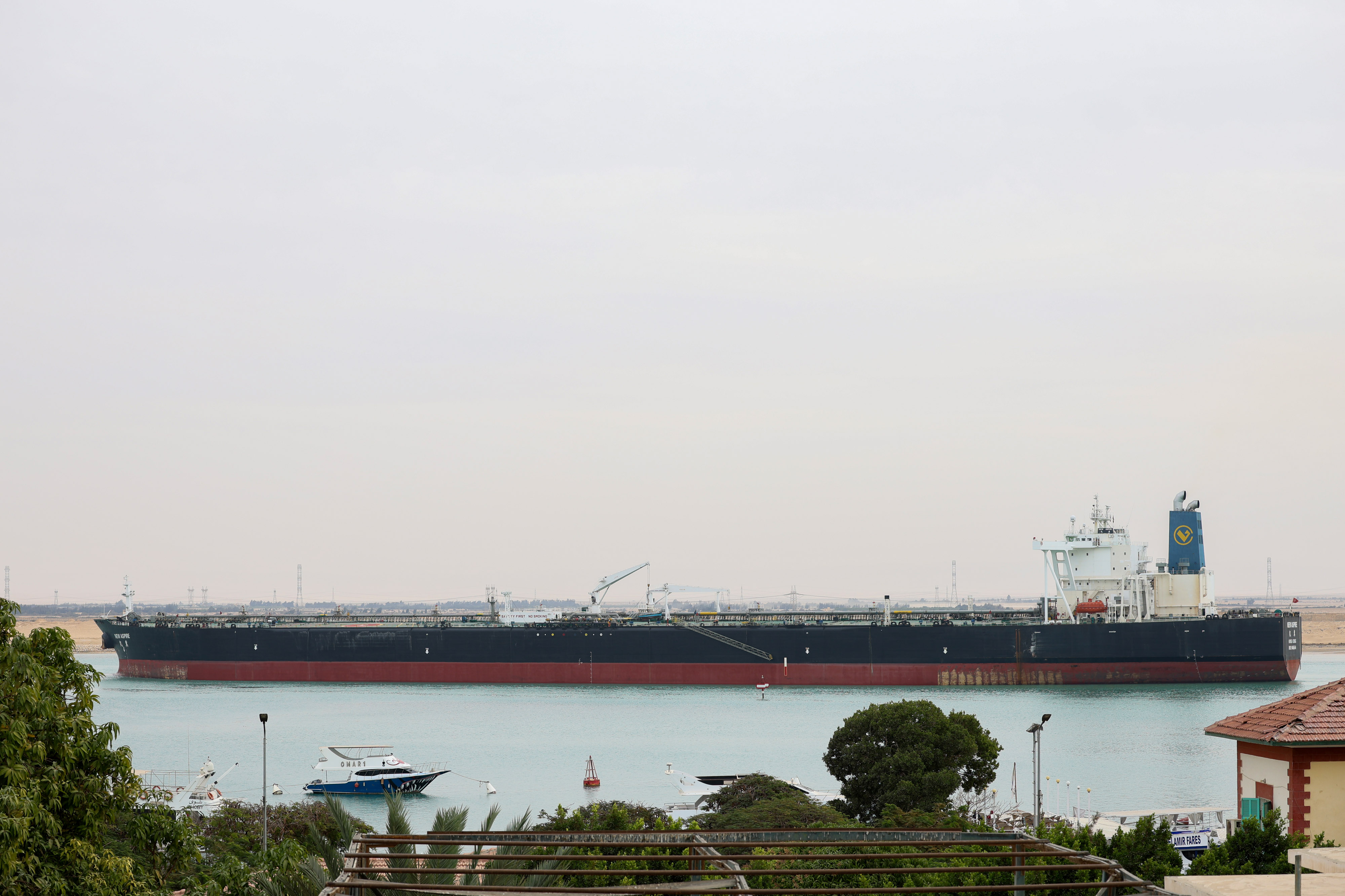 一艘油轮在重要的红海贸易动脉北端苏伊士运河航行。