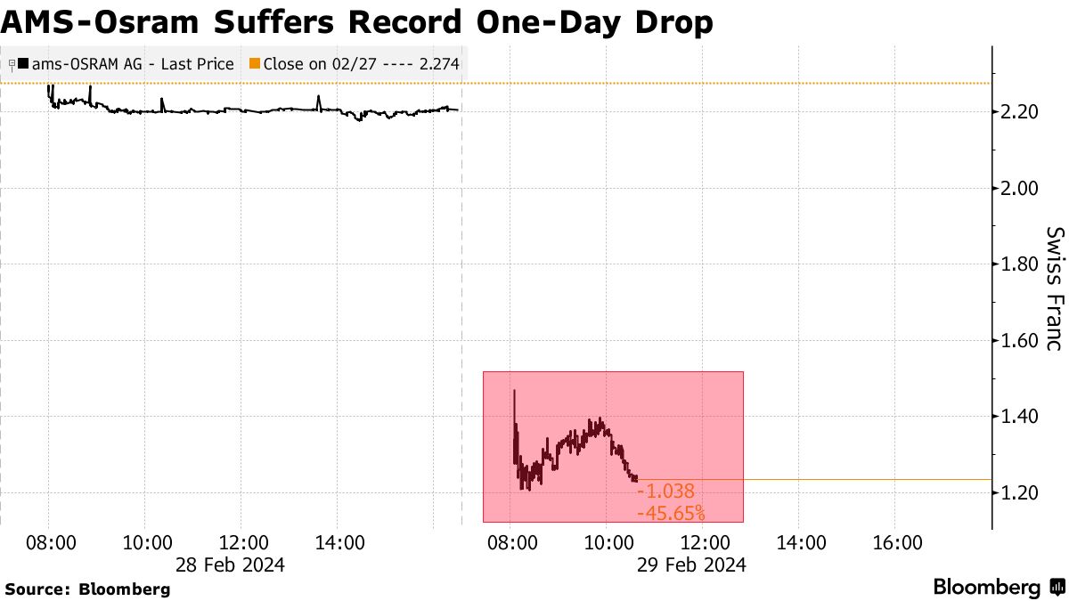 苹果供应商AMS-Osram在关键项目被取消后暴跌45% - 彭博报道