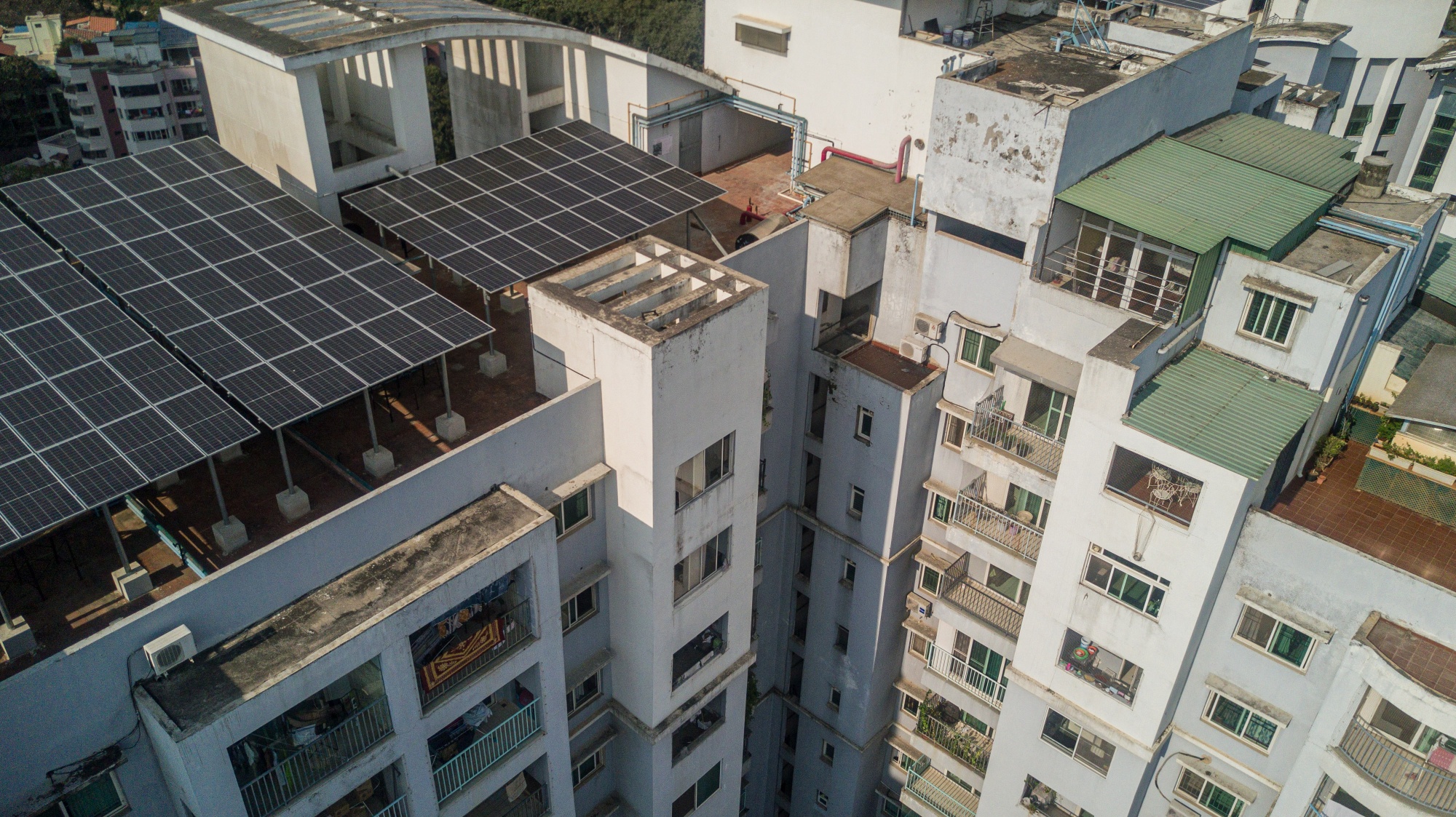 班加罗尔一座公寓楼屋顶上的太阳能电池板。