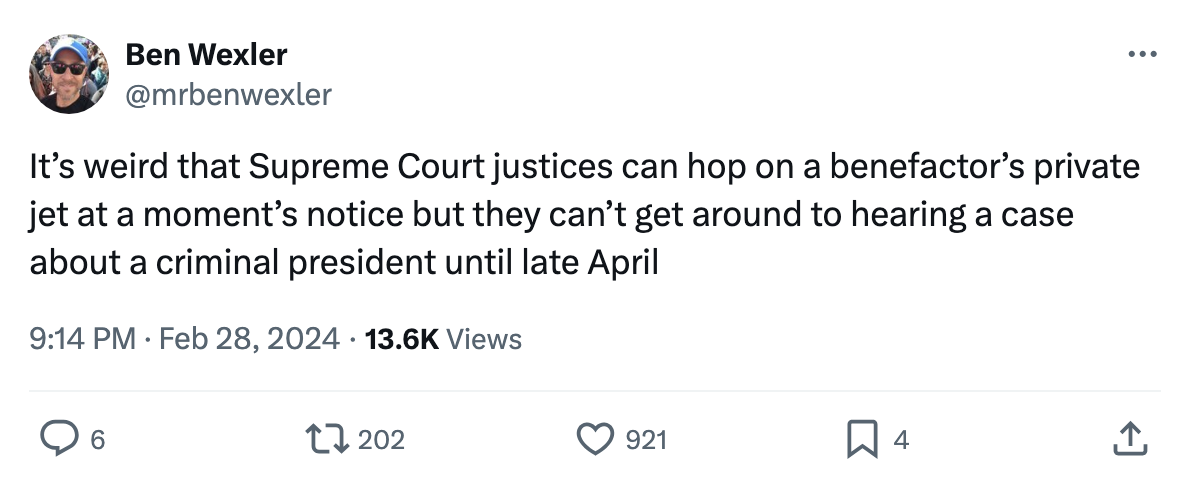 对美国国会大厦的袭击发生在三年零一个月零24天前,然而看起来特朗普的免疫权最高法院的决定要到6月底才会出来,他的审判会在那之后开始(可能在选举之后)。“进程如此漫长令人沮丧,”Noah Feldman写道(免费阅读)。但是尽管诱人,指责法院说,“拖延什么,最高法院?”诺亚建议不要这样做。“是起诉的时间安排,而不是最高法院的日程安排,解释了为什么现在时间如此紧迫,以便在选举日之前让特朗普接受审判。”