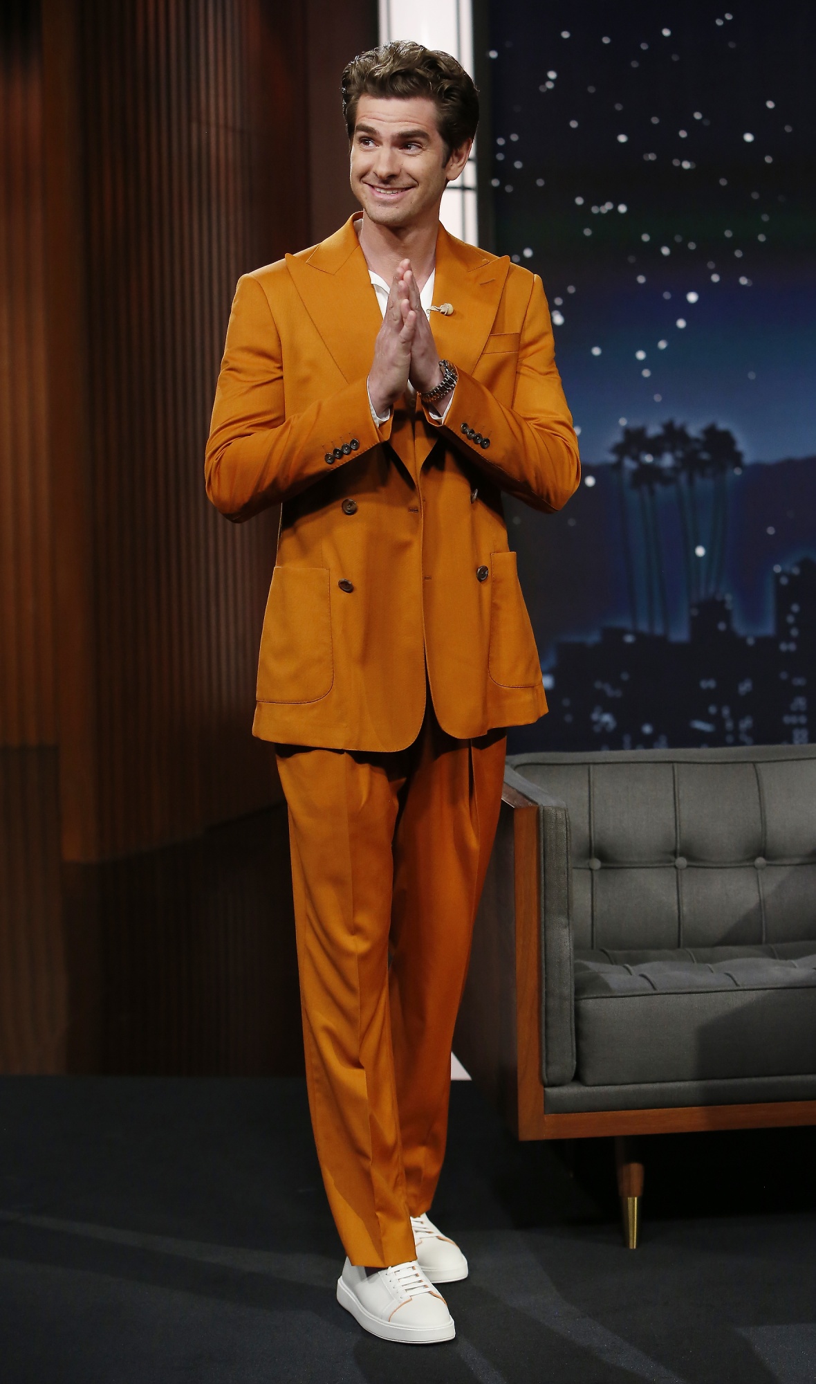 演员安德鲁·加菲尔德穿着理查德·詹姆斯(Richard James)的西装出现在*《吉米·坎摩现场》*摄影师:兰迪·霍尔姆斯/盖蒂图片社新店的设计灵感来自展示的男装:点点阶梯受到了商店领带的启发;1970年代的玻璃镂空吊灯下摆放着来自Loro Piana等全球奢侈品牌的面料。楼上是“剪裁”,按照汤姆·琼斯和本尼迪克特·康伯巴奇等著名理查德·詹姆斯客户的尺寸和合身度制作的西装。电梯壁涂成伦敦电话亭的红色,墙上挂着摇滚明星和皇室成员穿着该品牌西装的杂志封面。