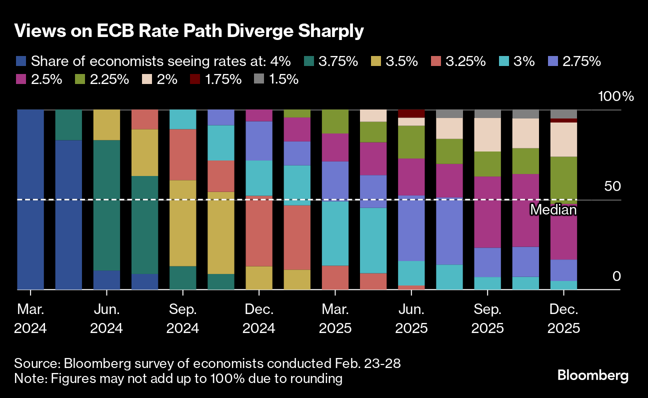 尽管经济学家们对2024年的预测略有调整,但他们仍然认为2025年底欧洲央行存款利率将保持在2.25%。
