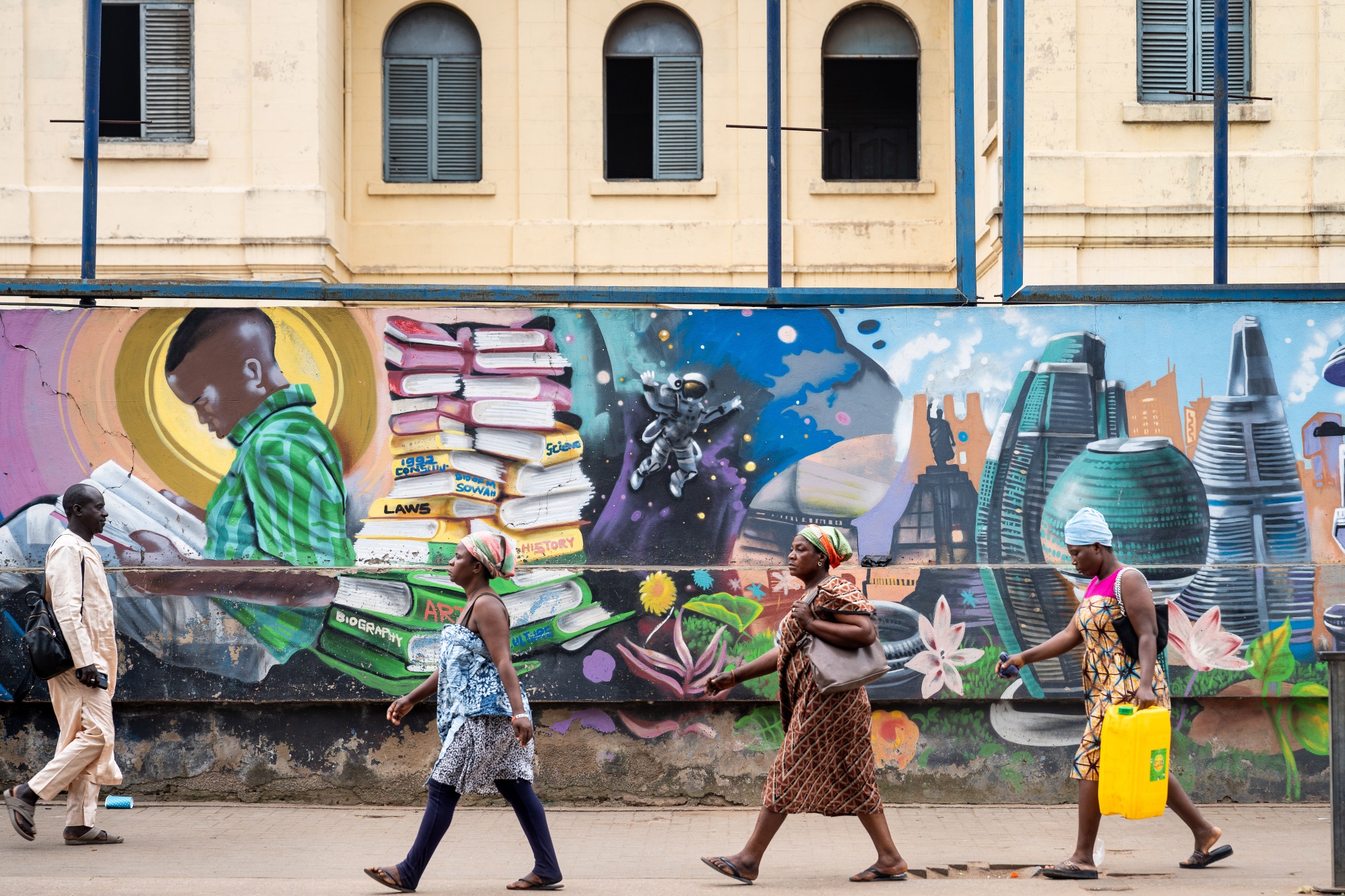 居民们在加纳阿克拉一所学校建筑外走过一幅街头艺术壁画。