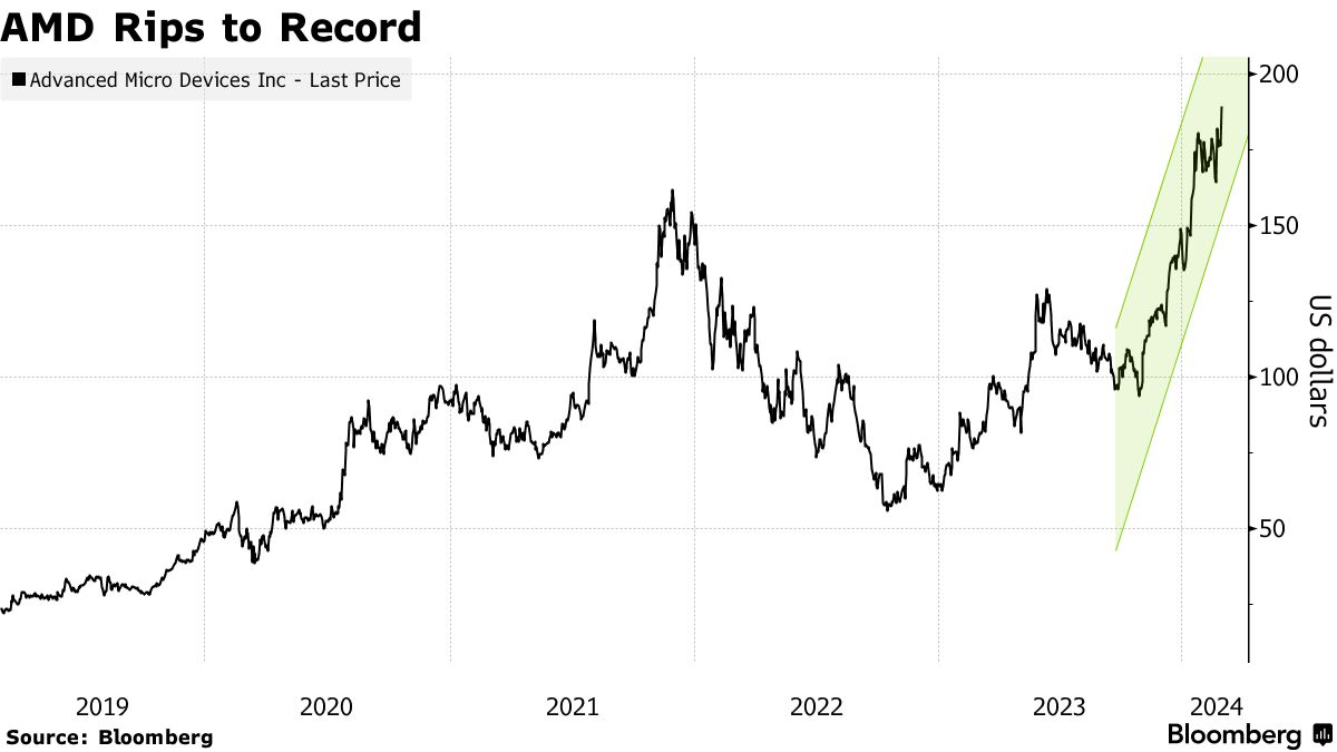 高级微处理器公司股价持续上涨,达到今年一系列最新纪录,被视为人工智能的主要受益者之一,对新的人工智能处理器的乐观情绪帮助AMD股价从疲弱的预测中恢复。