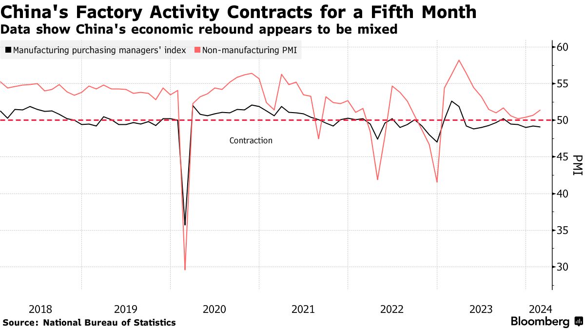 另外,中国的工厂活动在二月份连续第五个月收缩,表明疲弱的需求仍然是这个世界第二大经济体面临的障碍。