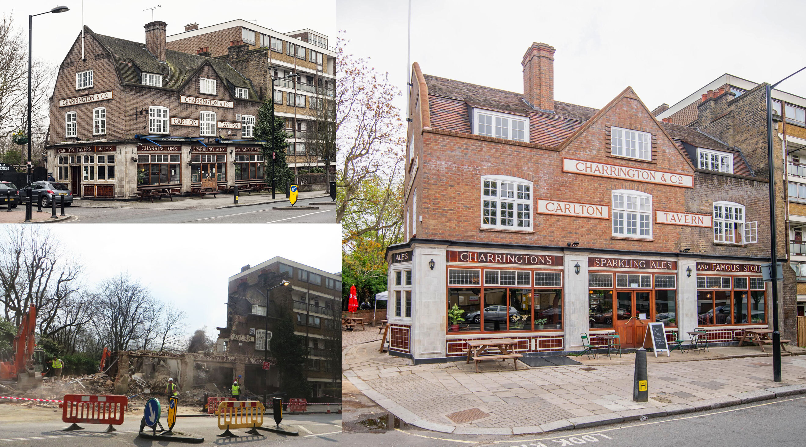 对于外部观察者来说,费力地重建一个歪曲的老建筑可能看起来非常不寻常,但在英国,这样的命令却出奇地常见。过去十年中,英国已经有第三家被拆毁的英国酒吧被命令重建。2015年,西北伦敦的卡尔顿酒馆,一家建于1921年的工艺风格酒吧被非法拆除以在其地点建造公寓楼,后来被重建为完全复制品,并已重新开业。兰开夏郡的Punch Bowl Inn的所有者在2021年6月将这座18世纪的酒吧拆除后,同样被命令重建。