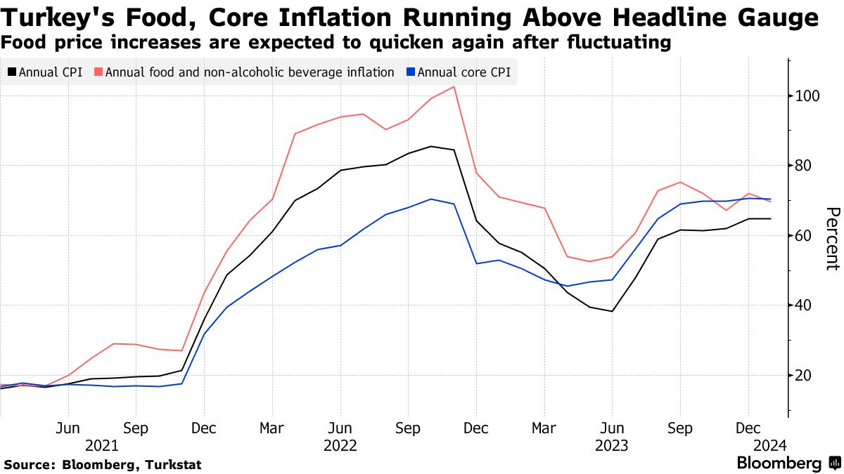 今年急剧上涨的最低工资标准与食品价格上涨相结合,推高了长期受通胀困扰的经济的成本压力。尽管土耳其里拉更加稳定,但根据国际货币基金组织的数据,土耳其有望在2024年结束时成为全球通胀第五快的国家,这一前景假定从年中开始将出现减速。