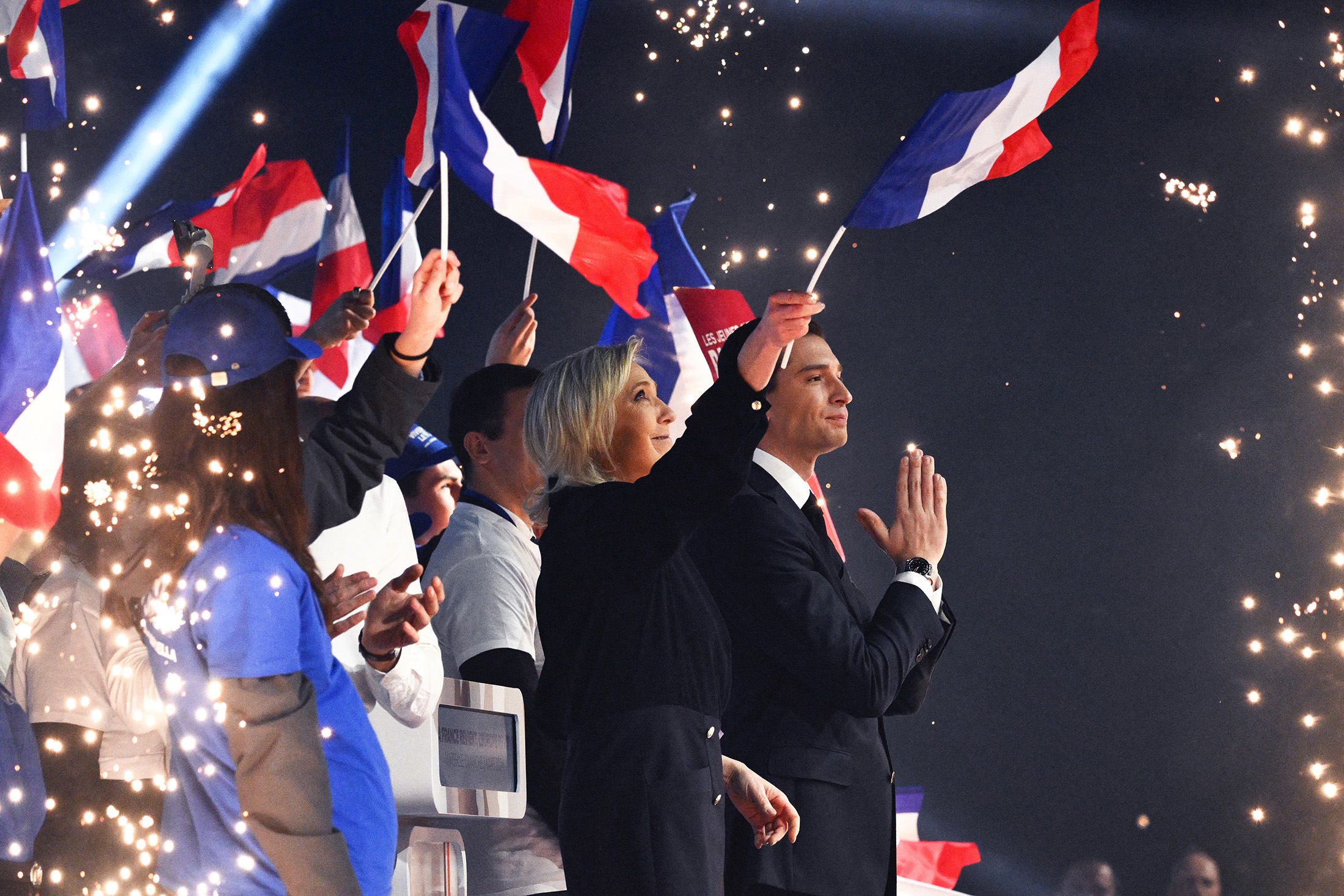 马琳·勒庞和乔丹·巴尔德拉在法国马赛为即将到来的欧洲选举启动了国民联盟(RN)的竞选活动,时间是3月3日。