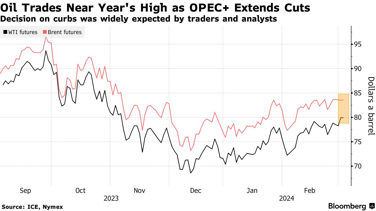 布伦特原油期货在周五上涨2%后,交投于每桶84美元附近。美国基准西德克萨斯中质原油接近80美元,周五首次自11月以来突破心理关口。石油输出国组织及其盟国延长了每日200万桶的减产三个月,延长至6月底。