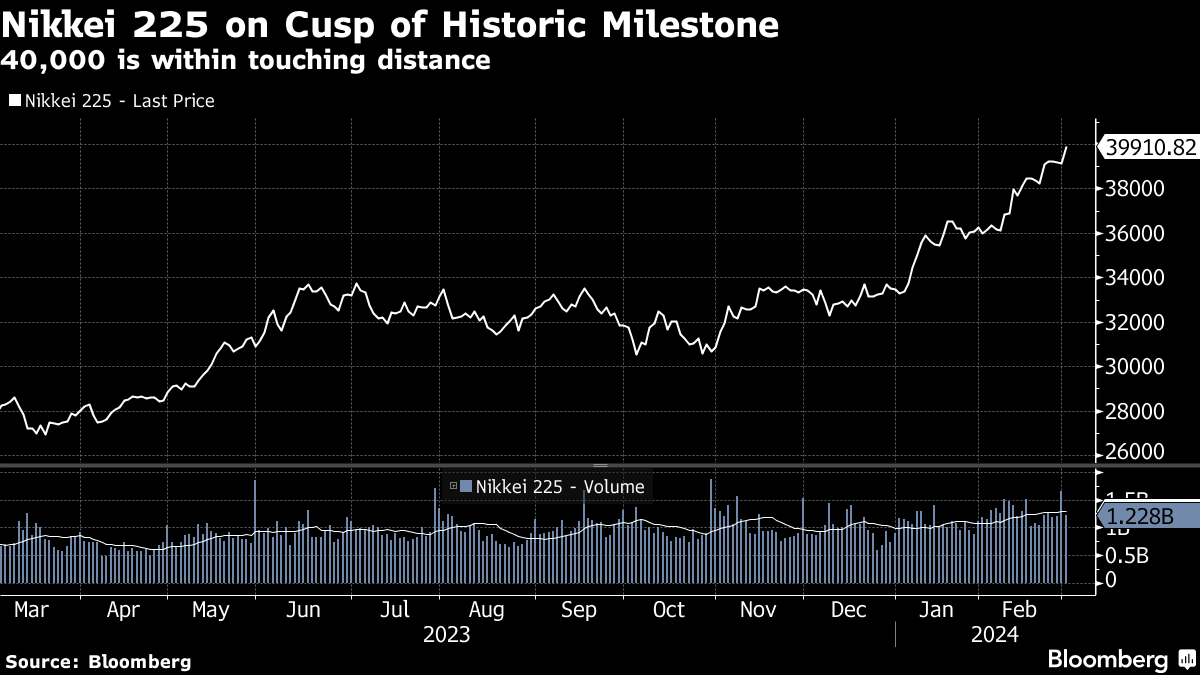 日经指数即将迎来历史性里程碑,40000点在望。其轨迹将取决于今早的第四季度公司利润数据是否证实了这波行情得到了强劲基本面的支撑。与此同时,货币贬值仍然支持股市行情,因为美元/日元在150左右徘徊。