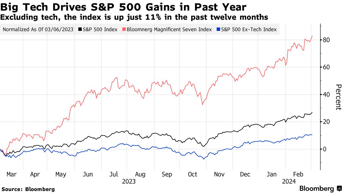所谓的“七巨头”——包括苹果公司、微软公司、英伟达公司、亚马逊公司、Meta平台公司、谷歌母公司和特斯拉公司——今年推动标普500指数创下历史新高,部分原因是人工智能的狂热。这些涨幅让策略师们在年初仅两个月的时间里匆忙提高了他们对基准指数的2024年终目标。
