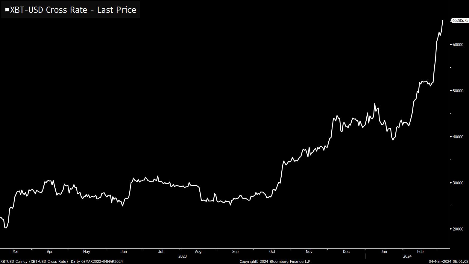 比特币还没有创下新纪录但正在接近,突破了65000美元,并继续受益于一月份推出的现货交易所交易基金的强劲需求。这种数字资产的迅猛上涨导致ETF创纪录流入,来自黑石和富达的产品吸引了最多资金,其他公司也在降低费用以跟上。在此期间,华尔街对加密货币的抵制逐渐消失。