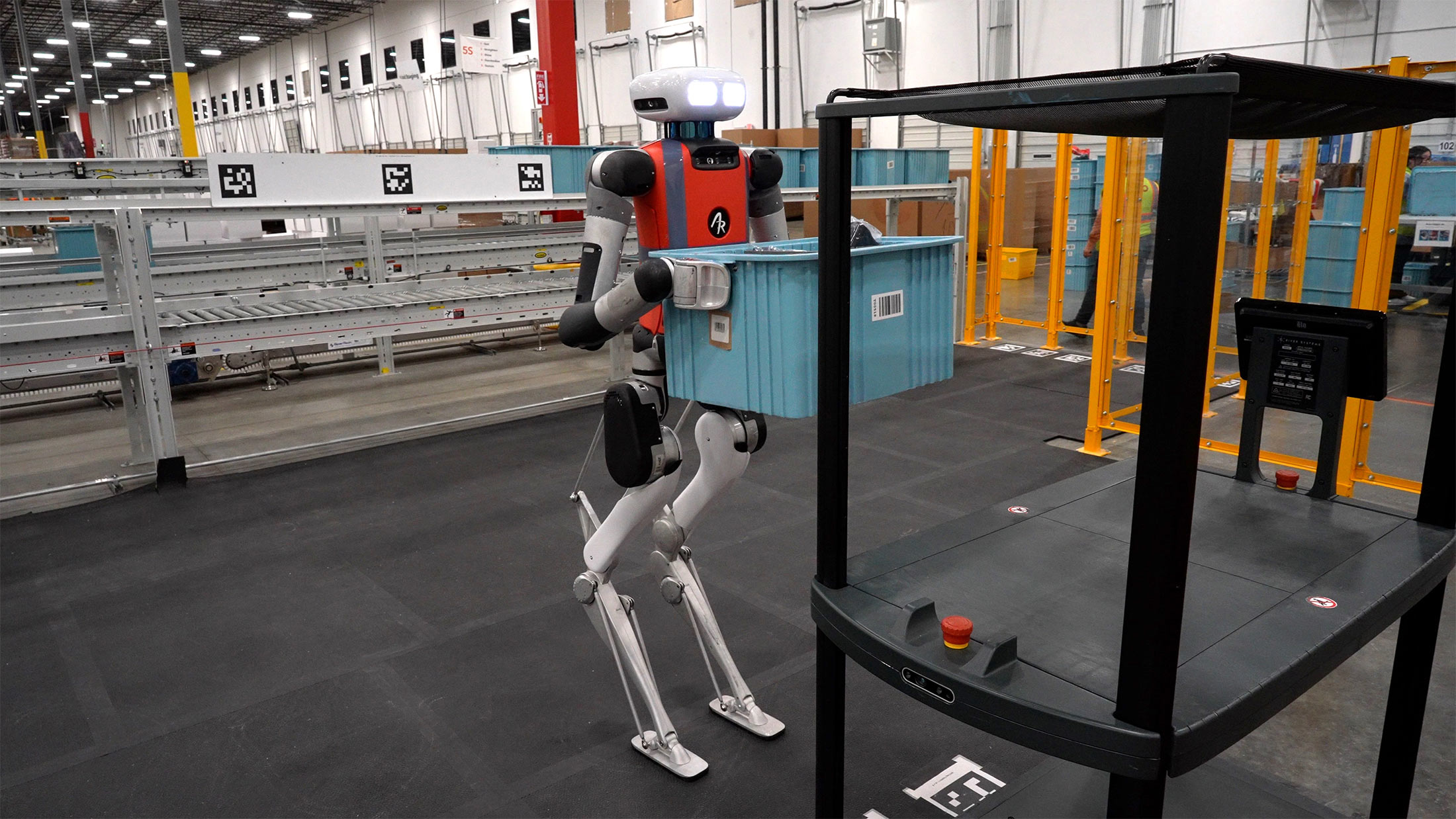 敏捷机器人制造的双足机器人Digit,在华盛顿州Sumner的亚马逊仓库进行搬运箱子的测试。